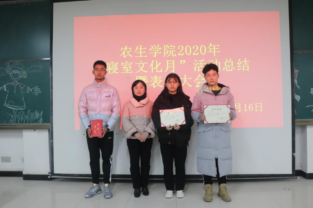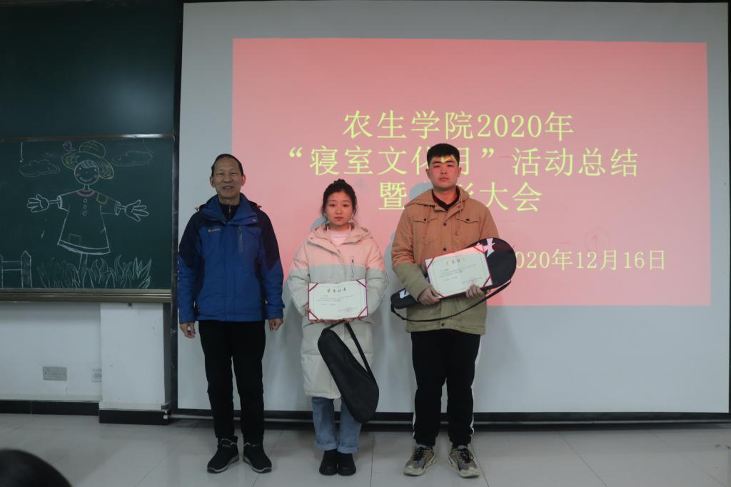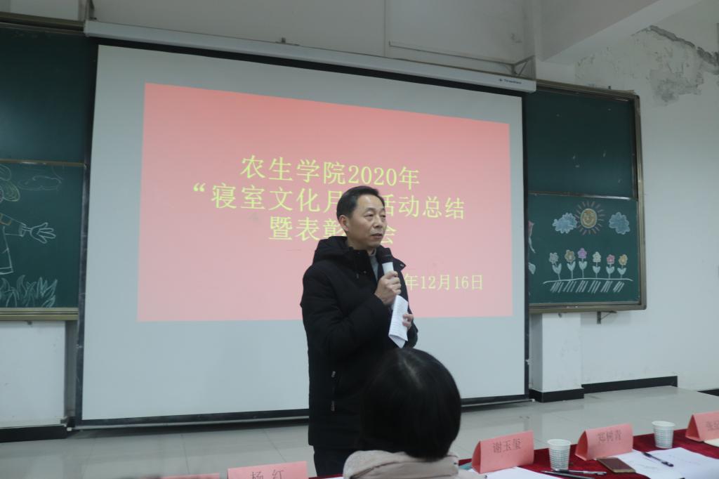 张纪生做总结讲话。通过寝室文化月活动的开展,他希望全体同学养成良好的生活习惯,丰富寝室文化生活,特别是员工党员、干部要带好头,发挥先锋模范作用,搞好寝室文化建设;在学习生活中,明确各个阶段的奋斗目标,付出努力,最终到达成功的彼岸;把在寝室文化月活动中养成的良好习惯保留下来,创造一个清洁、规范、⽂明、高雅的学习生活环境。冬季来临,他要求同学们进一步增强组织纪律观念,加强安全防范意识,做好人、财、物的安全防护。