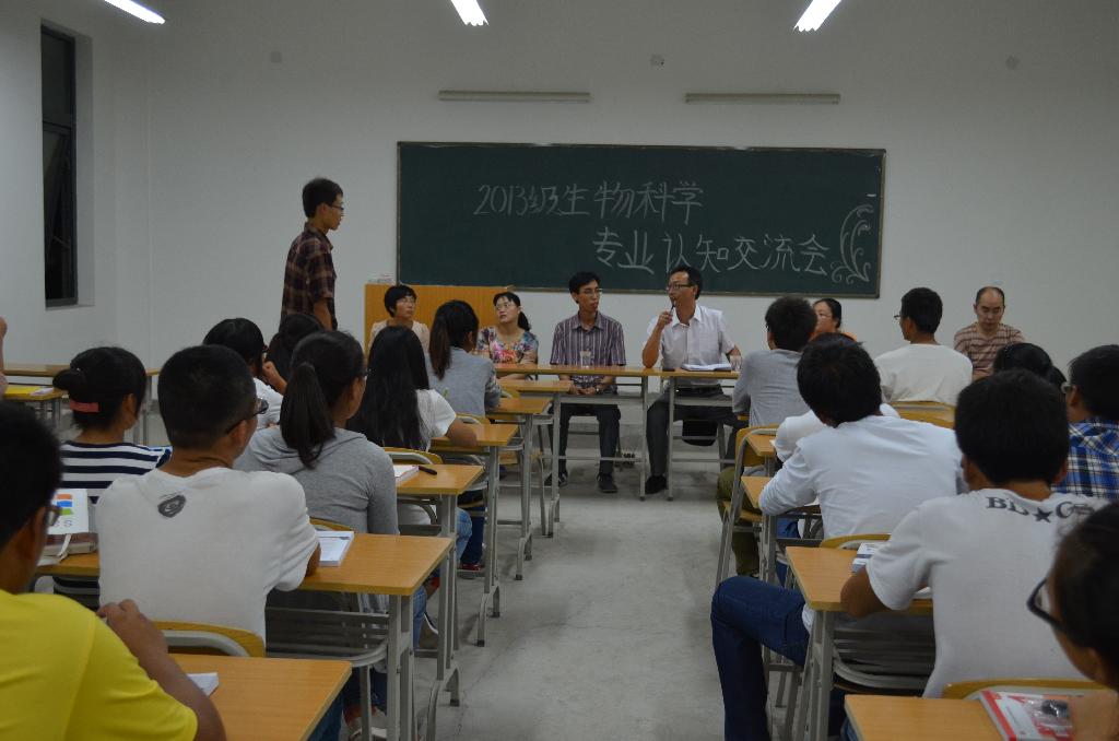 总支书记屈国胜参与2013级生物科学专业座谈会,就如何适应老员工活,强调大学的学习要有主动性和解决问题的目的性,着重培养自律意识,提前运筹职业生涯规划,鼓励同学们把握好大学的时间,合理规划,拓宽视野,以获取大的成就。