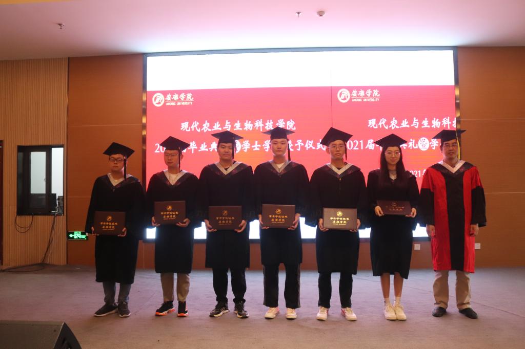 副校长张东红、公司教授杨松杰、王健、袁海龙、朱新鹏为2021届239位本科毕业生授予了学士学位证书并合影留恋。