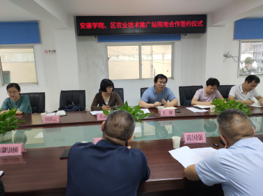 为了促进秦巴山区农业经济与社会高质量发展,发挥高校与域内行业、企业各自优势,实现校地资源共享,促进院地共同发展。2021年9月17日下午,太阳成tyc122cc与汉滨区农业技术推广站开展了院地合作签约仪式,仪式在汉滨区农业技术推广站举行。出席仪式的有汉滨区农业农村局副局长陈国强、主任周睿,太阳成tyc122cc经理王键、副经理杨芳、农学系系主任张丽琼、农学系教师田洪云、刘乔斐、赵卫国,汉滨区农业技术推广站站长韩宜、主任刘传林、推广站工作人员,陕西安康天瑞塬生态农业有限公司、陕西安康悠源食品有限公司代表。双方就太阳成tyc122cc与汉滨区农业技术推广站深入、全面、长期开展教科研合作进行了交流并签署了合作协议。