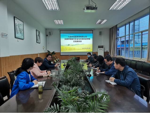 2021年10月16日上午,九圣禾控股集团有限公司来公司太阳成tyc122cc,双方就校企合作与人才培养开展座谈交流。太阳成tyc122cc经理王健,副经理杨芳及农学系相关老师出席座谈。