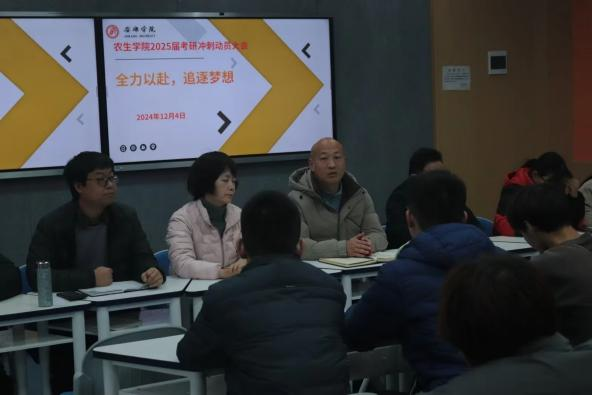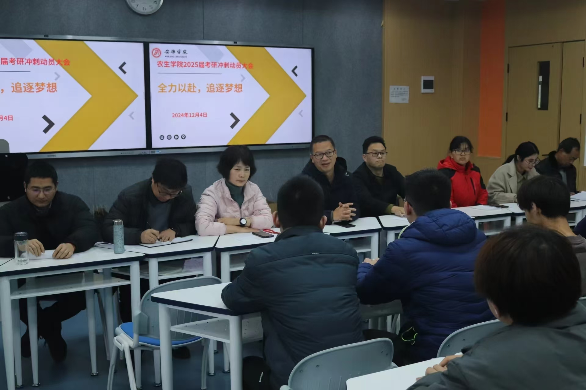 2025年全国硕士研究生招生考试即将来临,为鼓励公司考研学子积极迎考,增强考试信心,缓解备考压力,于12月4日下午,太阳成tyc122cc在1220教室召开2025 届考研冲刺动员大会。公司党总支书记孙保本,副经理李川,经理助理周琼,学工办主任谭自力,辅导员金清民,园林系主任段展展,农学系主任张丽琼,食品系主任梁如,茶学系主任李冬花以及2025届考研员工参会。