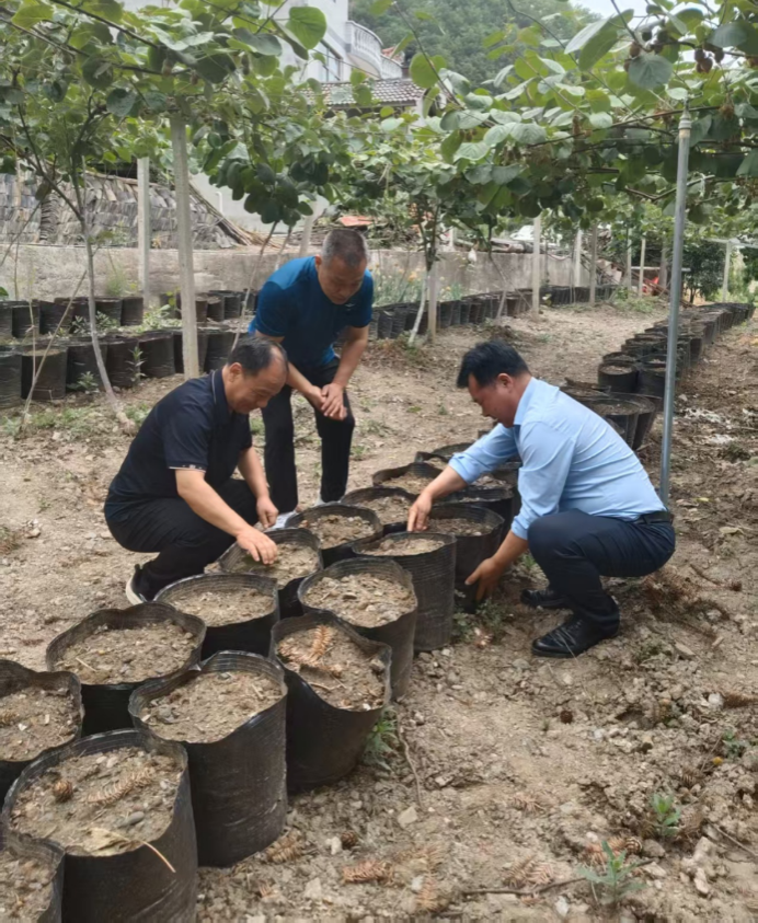 沈大刚和纪宏耀老师还对猕猴桃林下魔芋盆栽大户进行生产示范技术指导。