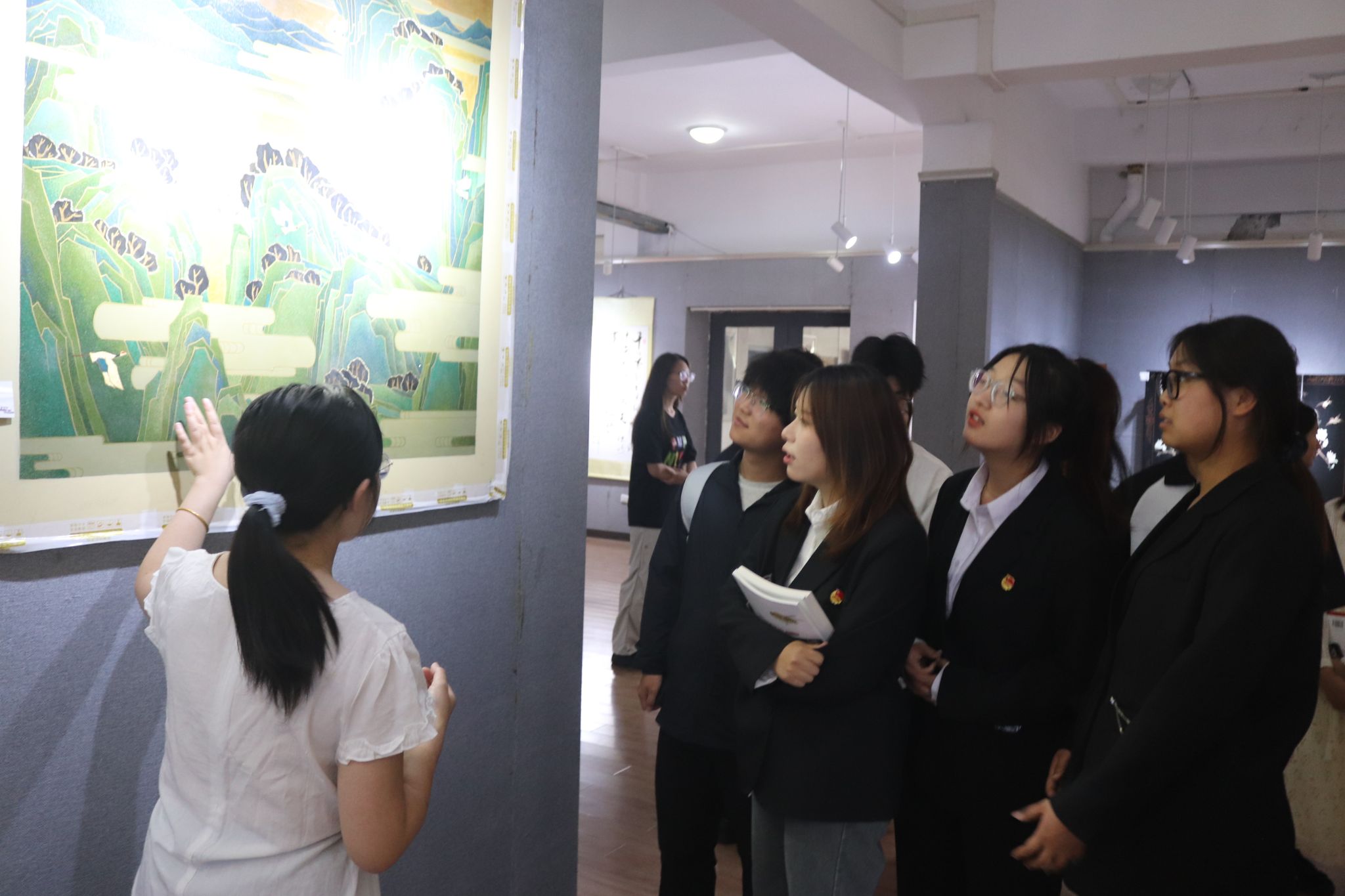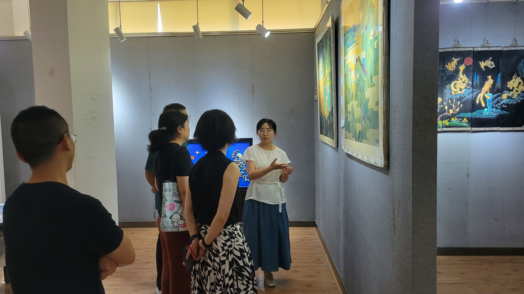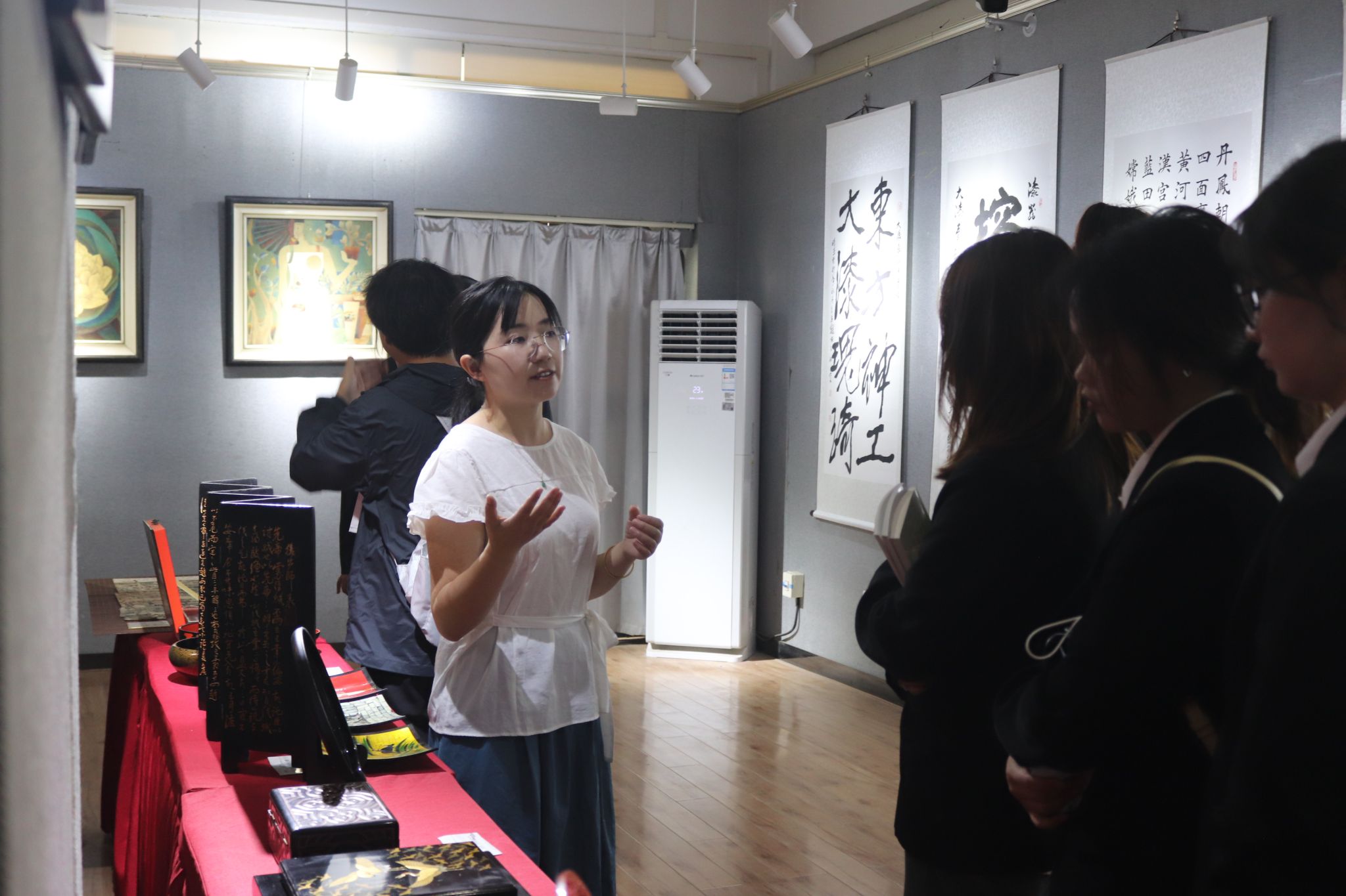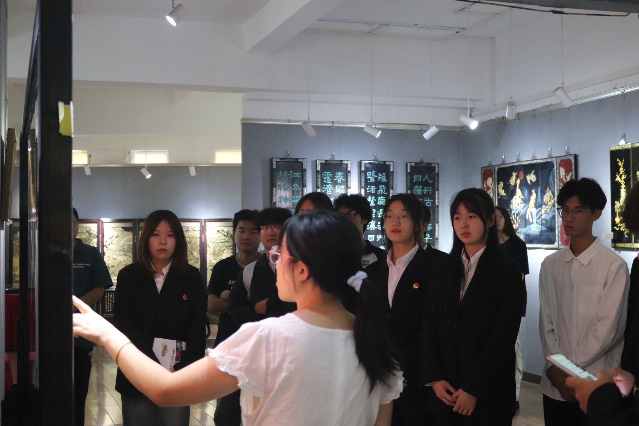 在讲解教师的引领下,公司师生系统了解了漆器从原料选取与处理、底漆涂刷、花纹描绘到成品打磨等关键制作环节,并针对不同工艺在质感和艺术表现上的差异作了深入阐述。师生分组驻足观摩,通过近距离鉴赏典型纹样和结构细节,进一步加深了对漆艺工艺流程的认识。