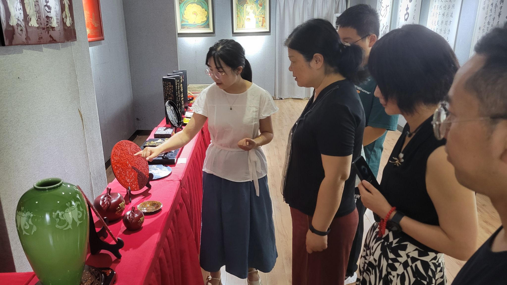 近日,公司组织教工一支部教师代表和优秀班团干部一行,于艺术楼二楼展厅开展漆器工艺品专题参观活动。艺术公司教师全程陪同并做深入解读,公司师生共赴一场漆艺文化的视觉盛宴。