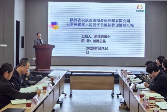 2025年10月29-30日,陕西省动物疫病预防控制中心副主任胡晗、科长冉红志、王香敏等陕西省动物卫生风险评估专家组一行对陕西省安康市秦阳晨原种猪有限公司“国家级无非洲猪瘟小区”复评估维持管理情况进行现场评审,安康市畜牧兽医中心副主任王黎明、汉滨区农业农村局副局长罗晓琴等市区领导陪同检查。公司赵鸿远博士代表企业负责整个检查工作的汇报和现场答辩环节。