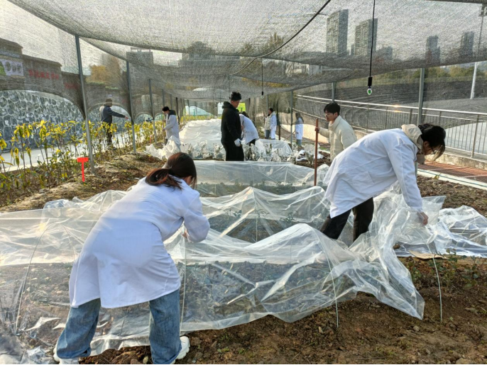 茶园管理是活动的重要组成部分。11~12月期间,员工们分组多次进行浇水、除草、施肥等日常维护工作,保障茶树水分充足。针对秋冬气温降低情况,还学习铺膜防冻技术,为茶树越冬做好防护。